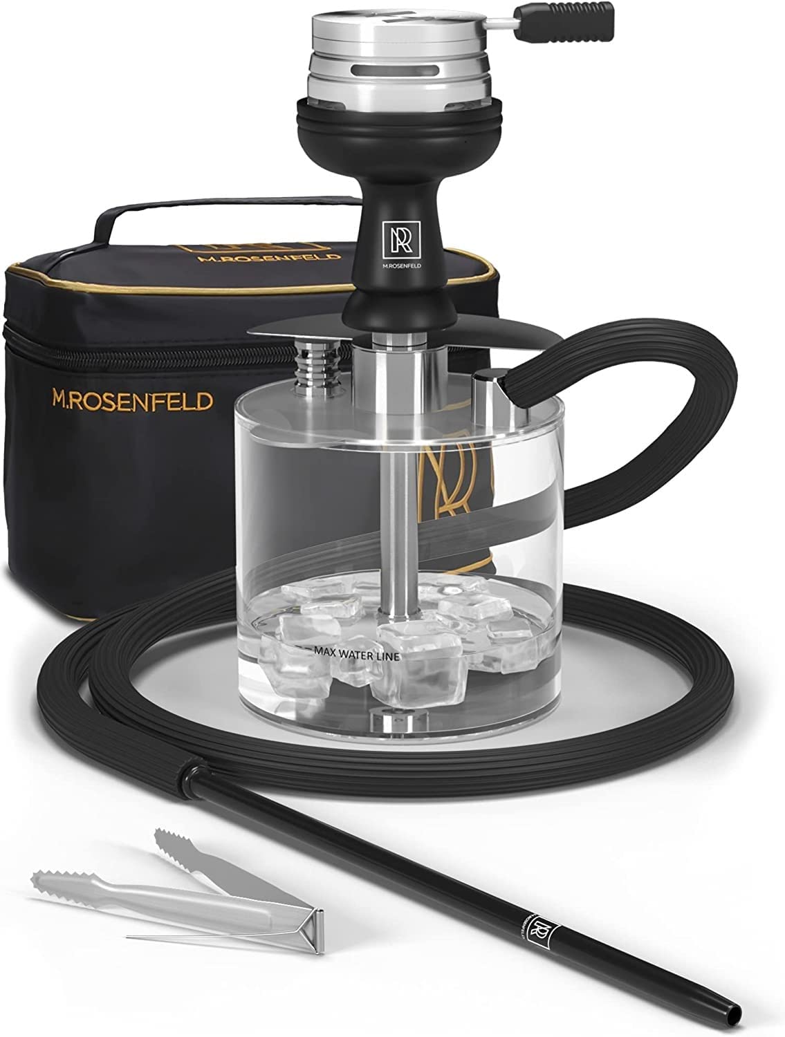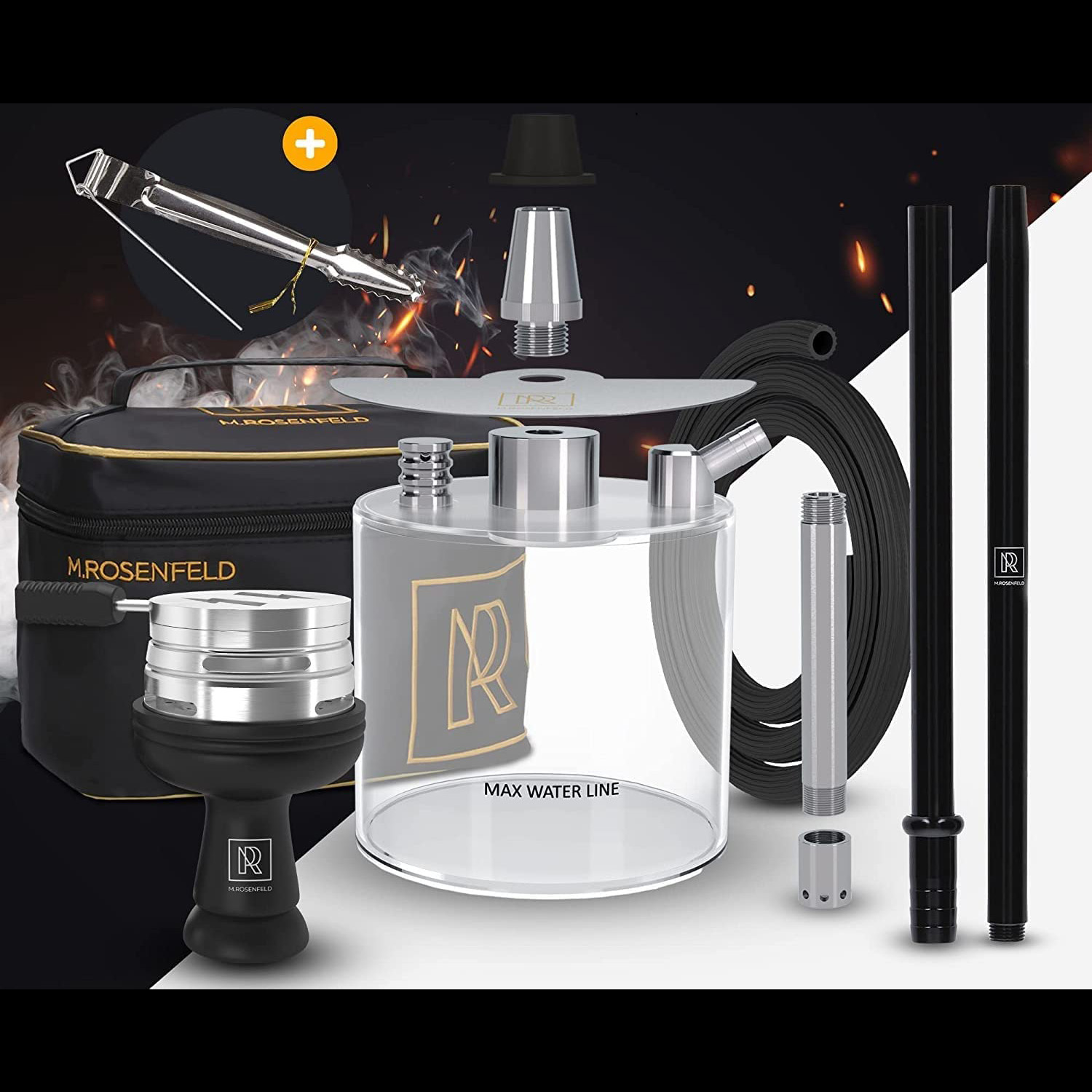 In diesem Wasserpfeifenset ist ein besonders hochwertiger, rostfreier Kohleaufsatz enthalten, in dem bis zu vier Kohlen Platz haben. Dieser hat einen praktischen Deckel mit hitzebeständigem Silikongriff zum Einstellen der Wärme. Des Weiteren wird die Wärme dank der angebrachten Lufteinlässe sehr schnell und optimal verteilt, sodass das “Anrauchen” und das “Experementieren”, ob die Kohle richtig platziert ist, wegfallen. Durch den Deckel wird mehr Wärme gespeichert und der Tabak kann nicht mehr verbrennen, sondern seinen vollen Geschamack entfalten. Auch der 1,5m lange Schlauch besteht aus hochwertigem, knickfreiem Soft-Touch-Silikon, der für einen optimalen Geschmack mitverantwortlich ist. Das zweiteilige, insgesamt 40cm lange Mundstück lässt sich sehr gut in der Hand halten und rundet diese Wasserpfeife ab.